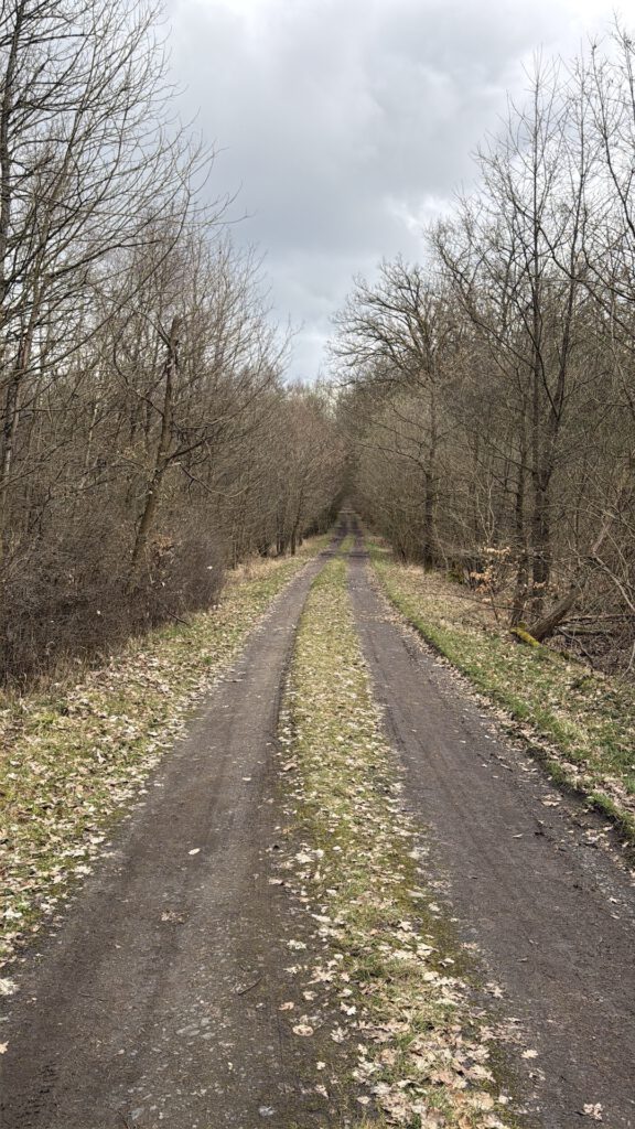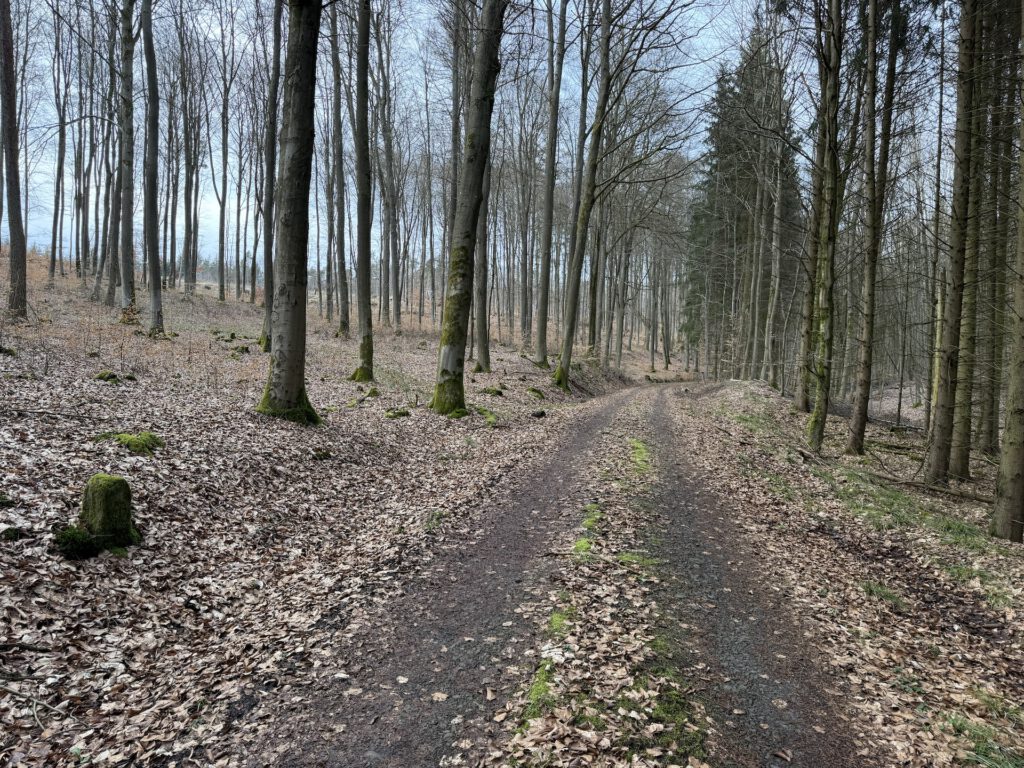 Wieder führten schöne Forstwege durchs Land, auch wenn Steigungen bis zu 7 % das Tempo deutlich dämpften. Zwischendurch gab es Abschnitte, die Rückegassen für die Holzernte ähnelten – eine Strecke, die ich mit Touren- oder Straßenrad niemandem empfehlen würde. Für ein Gravel Bike ist die Route gut geeignet, auch wenn ein oder zwei Abschnitte gute Fahrtechnik verlangen.