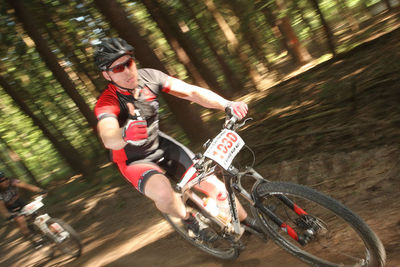 Nun zog die Steigung an. Minimum fünf Kilometer Steigung erwarteten mich jetzt. Mal steiler, mal etwas flacher ging es dem endlos wirkenden Berg hinauf. Die kämpfende Meute wirbelte vor mir so viel Staub auf, das die Sicht teils so eingeschränkt war, dass man nur die nächsten zwei Vorausfahrenden sehen konnte. Überholmanöver waren kaum möglich, so zog sich die Truppe auch über mehrere Kilometer nicht besonders weit auseinander. Außerdem waren die Forstwege erst vor kurzer Zeit neu geschottert worden. Ab von den Fahrspuren, wurde der Anstieg mit Überholmanövern zu einem zusätzlichen Kraftakt.