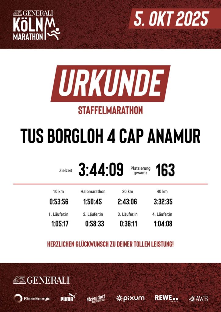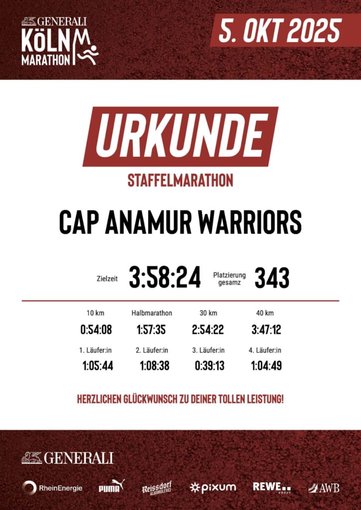 Im gesamten waren unsere Gruppen nicht weit auseinander. Ich denke es konnte jeder so seine persönlichen Erfolge feiern. Wichtiger und an erster Stelle war das Auftreten im Team und für was wir an den Start gegangen sind! Für Cap Anamur, für die Aufmerksamkeit, für die Menschen die die Projekte dringend brauchen! Und das war erfolgreich!